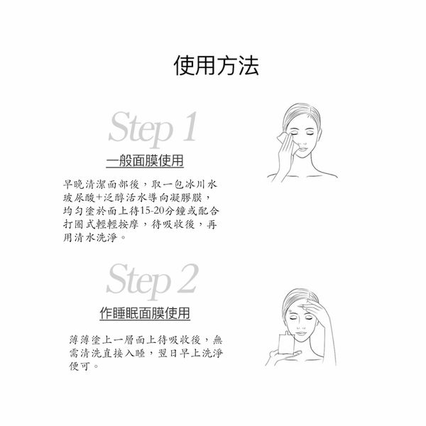 清潔面部後,取一包冰川水玻尿酸+泛醇活水導向凝膠膜,均匀塗於面上待15-20分鐘或配合按摩手輕輕打圈待吸收後,用清水洗淨便何。
