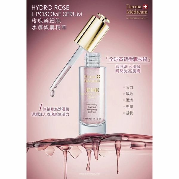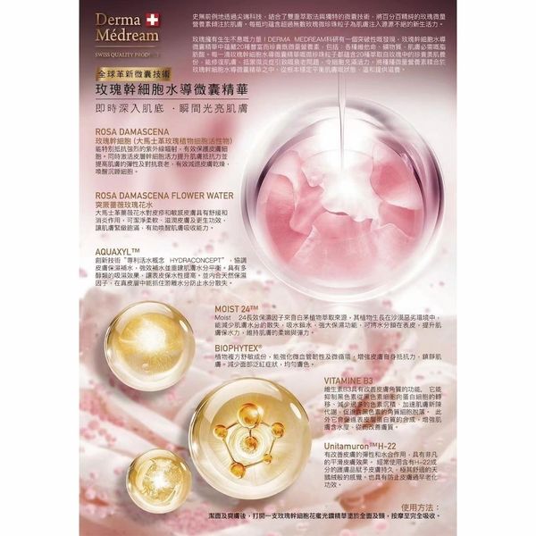 玫瑰擁有生生不息嘅力量!DERMA MEDREAM科研有一個突破性嘅發現,玫瑰幹細胞水導微囊精華中蘊藏20種豐富而珍貴既微量營養素,包括:各種維他命、礦物質、肌膚必需嘅脂肪酸。每一滴玫瑰幹細胞水導微囊精華嘅微珍珠粒子都蘊含20種萃取自玫瑰中的珍貴美肌養份,能修復肌膚,抵禦微炎症引致嘅衰老問題,令細胞充滿活力。將種種微量營養素糅合於玫瑰幹細胞水導微囊精華之中,從根本穩定平衡肌膚嘅狀態,溫和提供滋養。