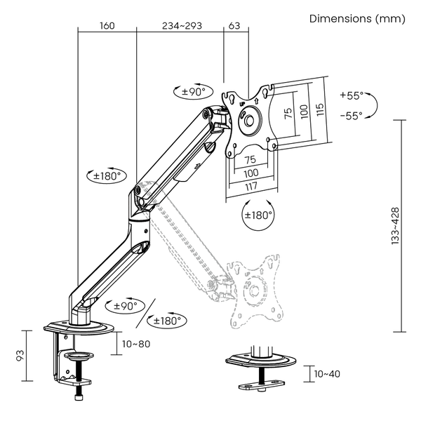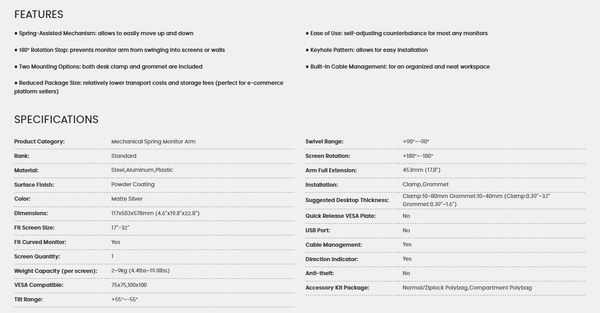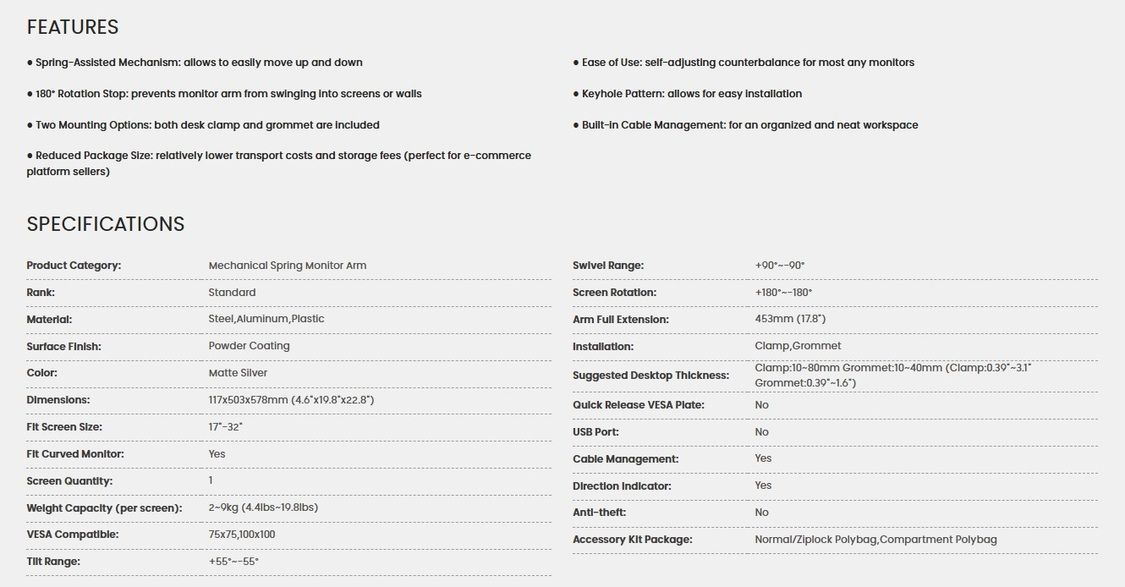 180° 旋轉停止裝置:防止螢幕臂擺動時撞到螢幕或牆壁。