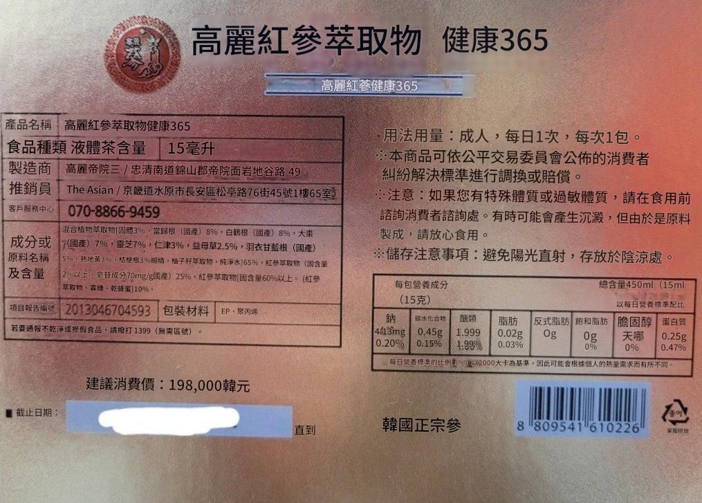 ✔6年紅參根濃縮液,有助補氣血、緩解疲勞、促進血液循環及改善睡眠