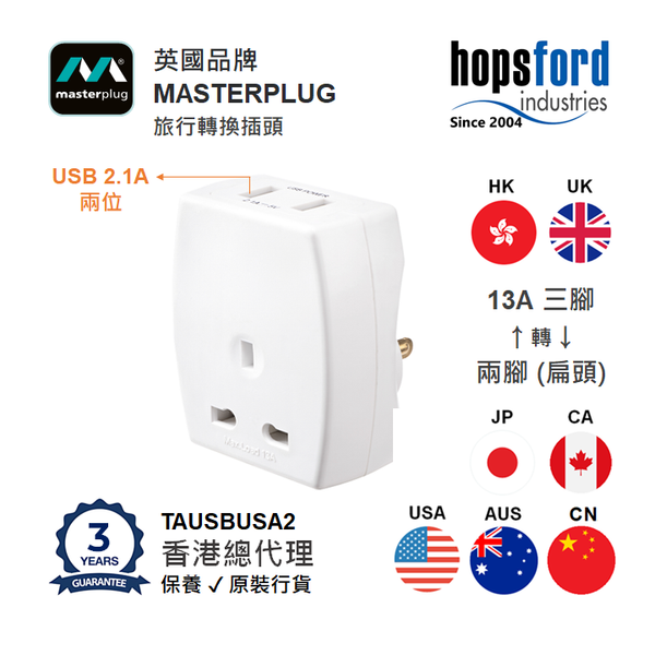 Masterplug USB 旅行轉換插頭 TAUSBUSA2 三腳-轉-兩腳扁頭 (合用國家-日本-加拿大-美國-澳大利亞-中國) 香港總代理
