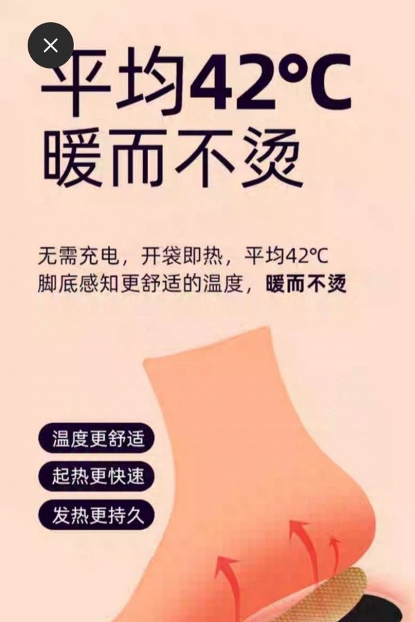 平均42度,暖而不燙,無需充電,開袋即熱,平均42度腳底感知更舒適的溫度,暖而不燙。