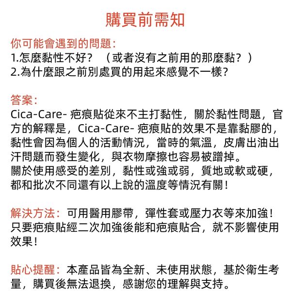 • 每片疤痕敵矽膠片可使用約1個月, 如開始損耗 / 失去黏性 / 清洗困難, 請即更換
