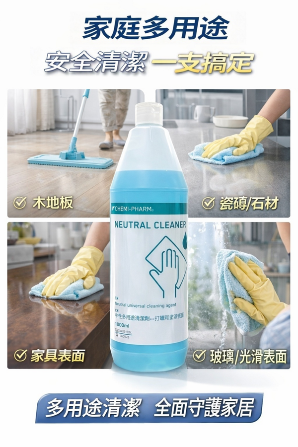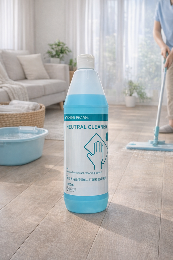 Neutral Cleaner 是來自歐洲 Chemi-Pharm 醫療品牌的多用途清潔劑,pH 中性、不含研磨劑、不傷表面,清潔同時守護你屋企的每一個角落。 適用於木地板、磁磚、石材、玻璃、漆面傢俬與牆面等各種可水洗表面,既潔淨又不損光澤。