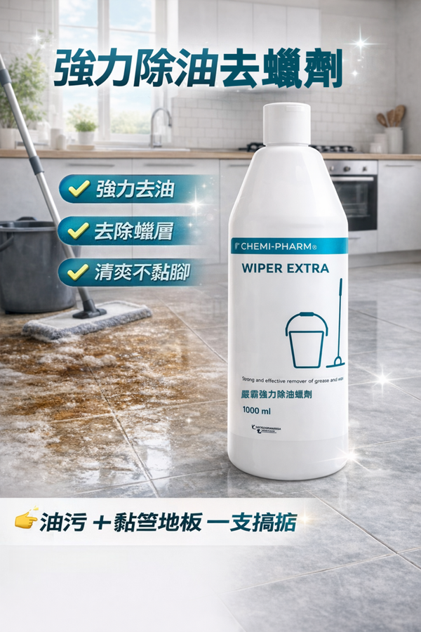 強力去油清潔劑|去除地板蠟|鹼性重油清潔劑|廚房地面去污|工業地板清潔|WIPER EXTRA|Chemi-Pharm|專業地板清潔|煙垢去除劑
