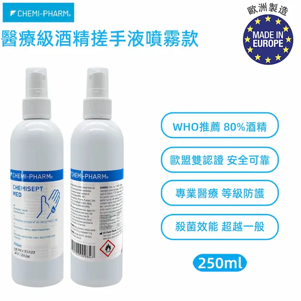 CHEMI-PHARM-(噴霧款)醫療級酒精搓手液Chemisept Med 250ml|滅活病毒力壓一般酒精 | WHO推薦80%乙醇配方|医院/診所/機構/家庭防疫必備#高效殺菌|敏感肌適用|無香料無色素|消毒酒精火酒