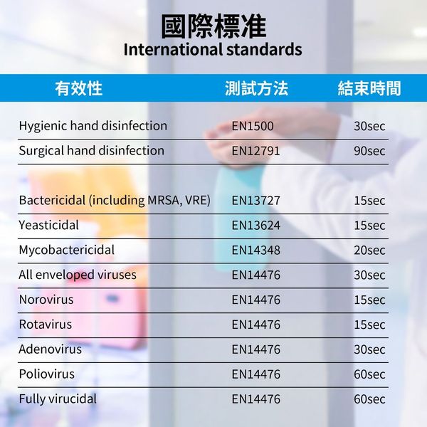 • EN1500:日常手部消毒(30秒內有效)
