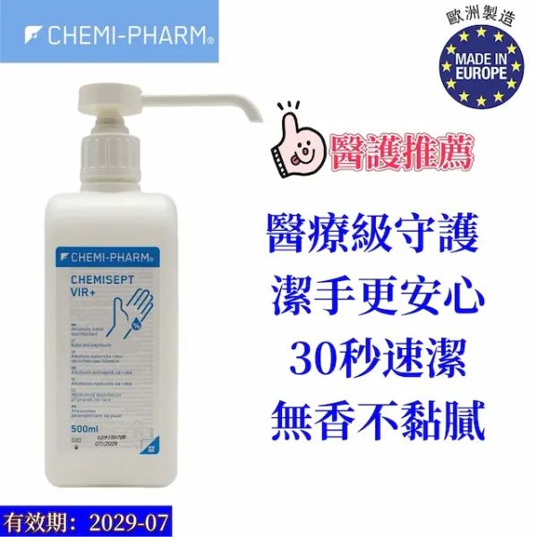 Chemisept VIR+ 是由愛沙尼亞 Chemi-Pharm 開發的醫療級酒精搓手液,專為醫療機構與高風險傳染防控情境設計,現亦廣泛應用於食品行業、商業空間與高標準家庭防疫中。其不含香料與色素,對皮膚刺激低,能迅速殺菌且不殘留,使用後不影響觸控設備、不沾手。