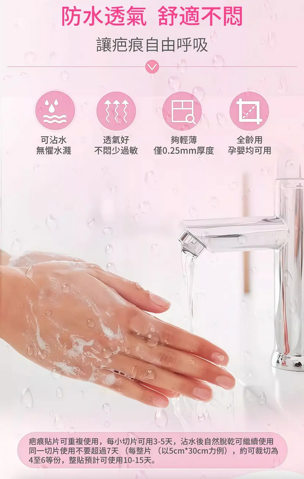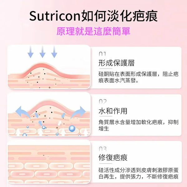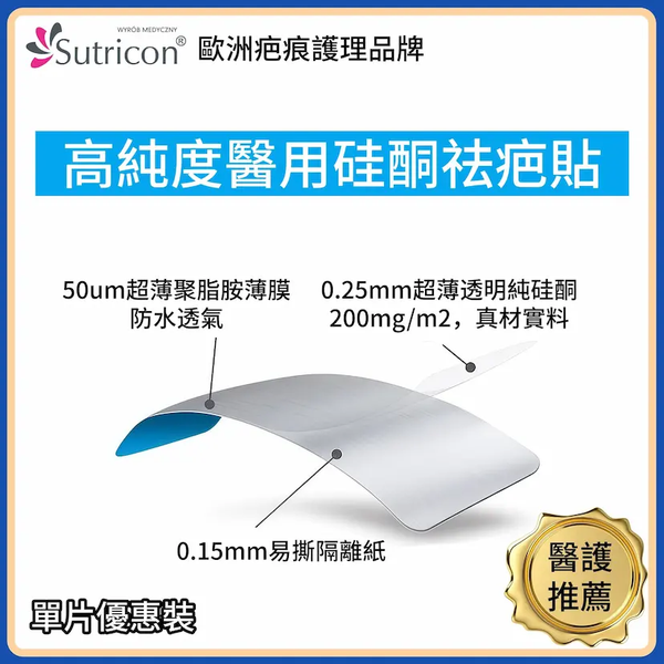 【醫療級|疤痕護理矽膠貼片】Sutricon 疤痕矽膠貼片 5×30cm 拆售單片(超薄0.25mm|可裁剪|貼合透氣|可重複使用|孕紋/手術疤痕/燙傷疤痕護理適用|1片裝)有效期:l2030-04