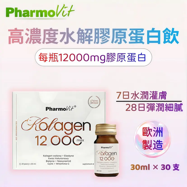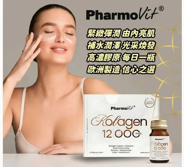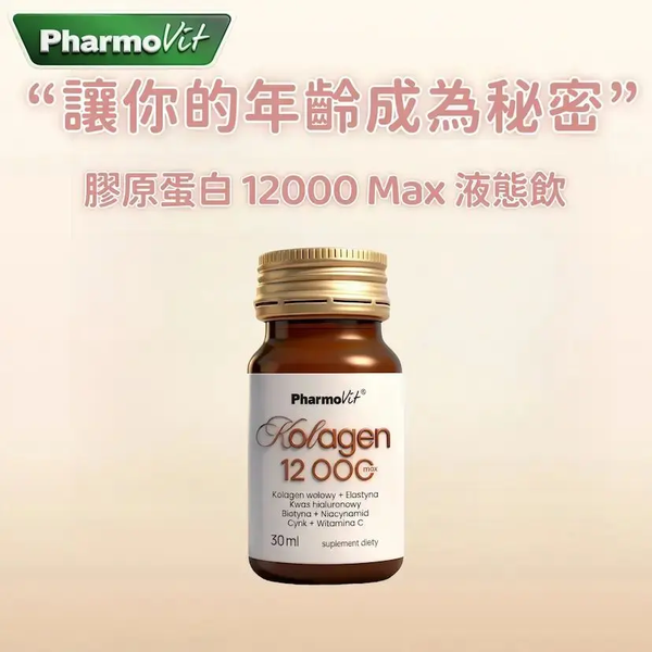 Pharmovit 膠原蛋白 12000 Max 液態飲|歐洲製造・高濃度水解膠原蛋白・添加維他命C、鋅與玻尿酸・促進膚質緊緻與頭髮指甲健康・每日1瓶維持自然彈性|平行進口|31-10-2026