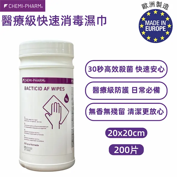 CHEMI-PHARM-Bacticid AF Wipes 醫療級快速消毒濕巾|30秒高效滅菌|無香無殘留|適用醫療設備與酒精耐受表面| 200片20CM*20CM |有效期:2027-06-30