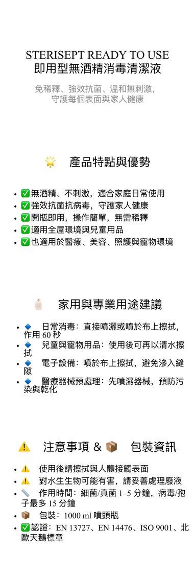 產品名稱:Sterisept Ready to Use 無酒精即用型表面消毒劑