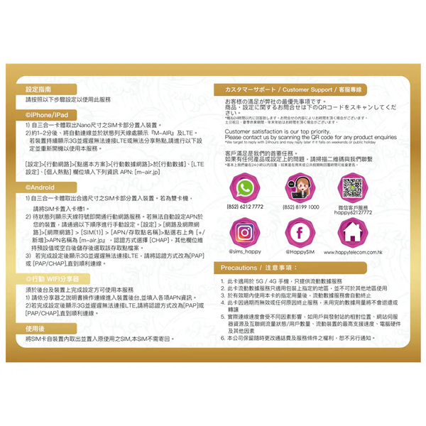 完全不須個人身分認證、信用卡註冊、綁約、管理費、解約金等商品外費用。Nippon SIM for Japan為日本政府登記在案之電信運營商「株式会社DHA Corporation」(電気通信事業届出番号:A-30-16419)所提供之日本當地上網服務。本公司完整提供從售前到售後之所有服務,專業客服人員精通中英日等多國語言,提供最貼心的客服。若您對商品或設定有任何疑問,歡迎隨時與我們聯繫。