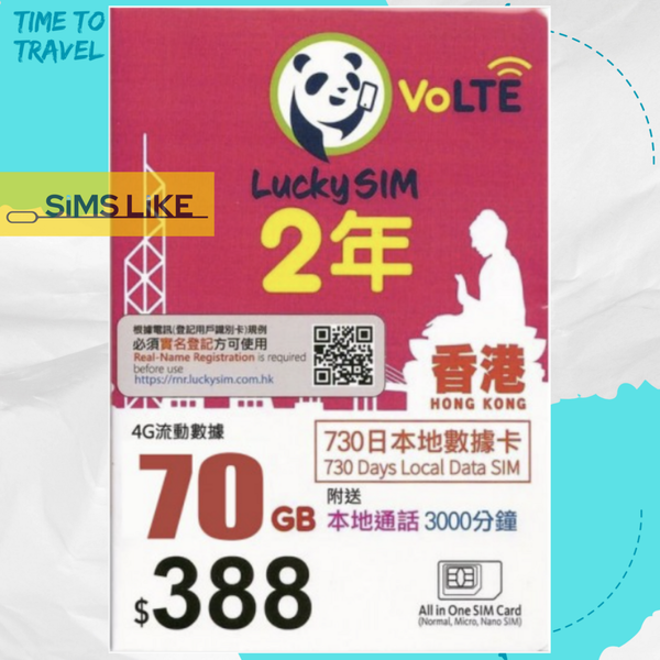 Lucky Sim 4G 香港SIM卡 730日 2年 70GB上網 3000分鐘本地通話 Volte 本地數據 SIM