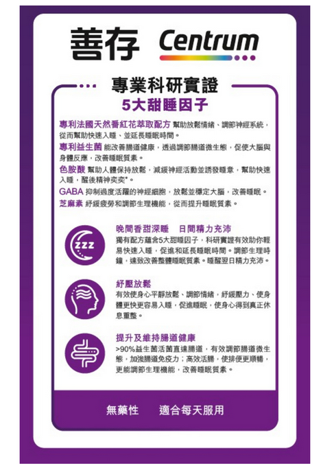 提升及維持腸道健康,加強腸道免疫力,從而調節生理機能,改善睡眠質素