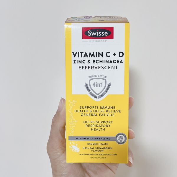 Swisse Ultiboost 維他命C D 鋅 + 紫錐菊泡騰片 是一款高品質且美味的健康補充品,蘊含維他命C、維他命D、鋅及紫錐花成份,有助維持免疫系統健康,同時舒緩日常的疲勞感。