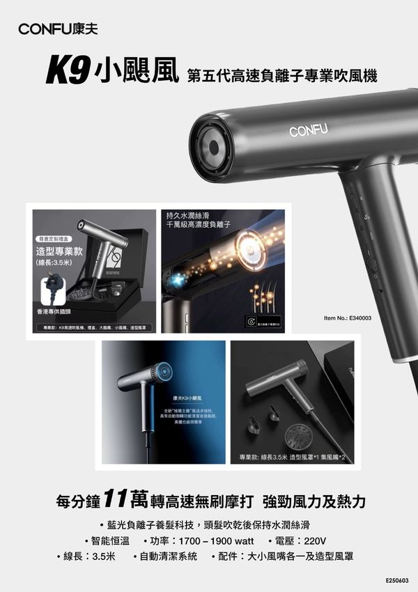 CONFU K9小颶第五代風高速負離子 專業電吹風220V 110,000轉/MIN 1700-1900W BS PLUG