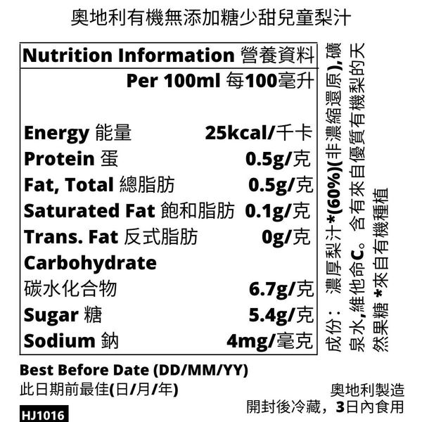 HOLLINGER-有機無添加糖少甜兒童梨汁, 200毫升x3 環保紙吸管,全素