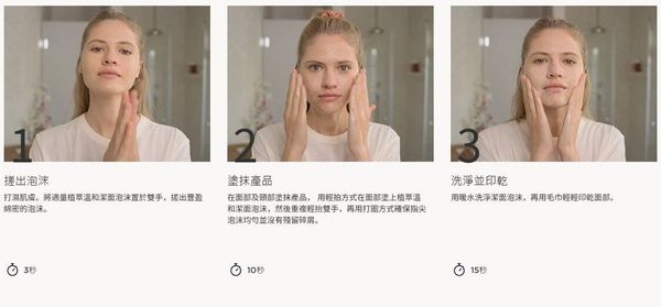 濕潤肌膚後,以沾濕的雙手取少量潔面泡沫,並暖和起泡。將泡沫輕塗於面部和頸部。如要清除彩妝和污垢雜質,請將雙手輕輕平貼面部,猶如肌膚感到灼痛時而迅速移開雙手一樣。重複動作七次。接著在面部和頸部以打圈方式輕柔按摩,並避開眼周肌膚。沖洗後使用肌膚類型適用的爽膚水。