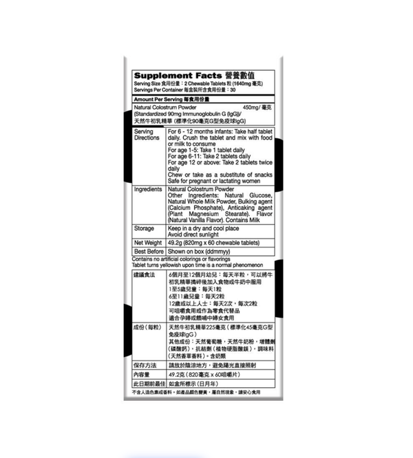 6個月至12個月幼兒:每天半粒,可以將牛初乳精華搗碎後加入食