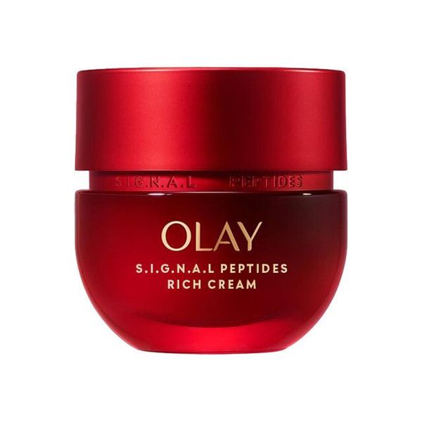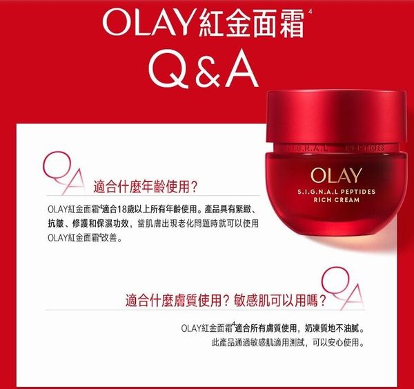 很多女生都曾嘗試使用千元面霜為肌膚抗老,卻發現效果並不明顯,一笑起來臉上仍然會浮現法令紋、魚尾紋,而且肌膚鬆弛下垂、缺乏彈性,可能是因為你選的面霜成分和功效太單一!傳統的保養概念認爲對抗皺紋、提拉面部肌膚只需補充「膠原蛋白」就夠了,但OLAY研究發現,彈嫩緊緻的肌膚原來還不可缺少「彈性蛋白」和「肌底膜蛋白」,彷如飽滿的床褥不但需要綿花填充,彈弓、膠水也定奪整體彈力和支撐力。所以,如果想有明顯減齡效果,面霜的保養功效就要超越保濕,更要超越單一膠原方案。OLAY的皇牌抗皺面霜-紅金面霜加入重磅升級的Signal Peptide訊號肽組合,突破性激活 「膠原蛋白」、「彈性蛋白」和「肌底膜蛋白」3大抗老蛋白,配合珍稀的南法白鑽松露 ”修護強韌肌膚屏障,打造全方位極緻抗老功效,一瓶做到抗皺+淡紋+緊緻+保濕,配合三步提拉按摩手法,便能有效緊緻面部輪廓,讓你重拾年輕氣色!