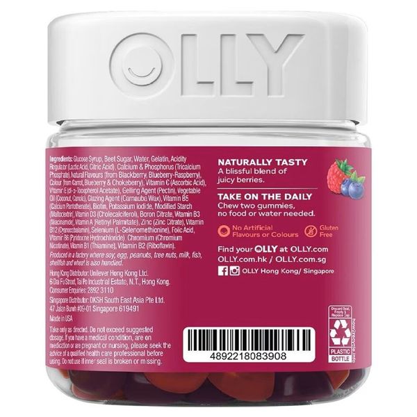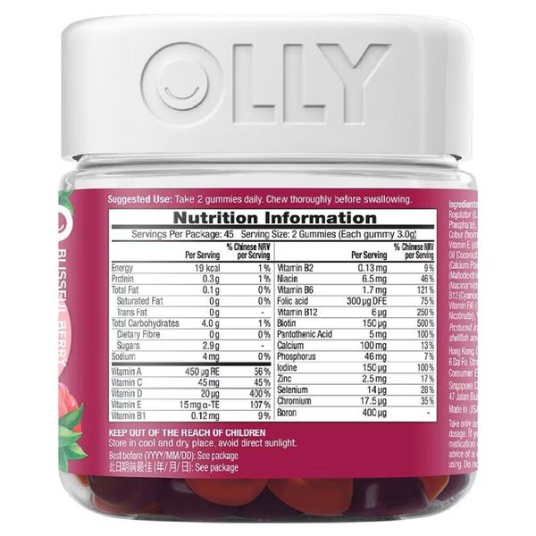 成分: 葡萄糖漿、甜菜糖、水、明膠、乳酸、檸檬酸、鈣和磷(磷酸三鈣)、天然香料(來自黑莓、藍莓-覆盆子)、天然色素(來自胡蘿蔔、藍莓和苦莓)、維他命 C (抗壞血酸)、維他命 E(dl-¬-生育酚乙酸酯)、果膠、植物油(椰子、菜籽油)、巴西棕櫚蠟、維他命 B5(泛酸鈣)、生物素、碘化鉀、改性澱粉(麥芽糊精)、維他命 D3( 膽鈣化醇)、檸檬酸硼、維他命 B3(煙酰胺)、維他命 A(棕櫚酸視黃酯)、鋅(檸檬酸鋅)、維他命 B12(氰鈷胺)、硒(L-硒代蛋氨酸)、葉酸、維他命 B6(鹽酸吡哆醇)、鉻( 煙酸鉻)、維他命 B1(硫胺素)、維他命 B2(核黃素)。
