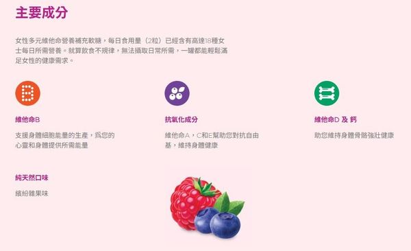 女性多元維他命營養補充軟糖,每日食用量(2粒)已經含有高達18種女士每日所需營養。就算飲食不規律,無法攝取日常所需,一罐都能輕鬆滿足女性的健康需求。