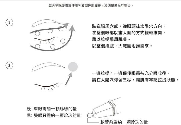 使用方法:每天早晚護膚於使用乳液調理肌膚後,取適量產品於指尖。