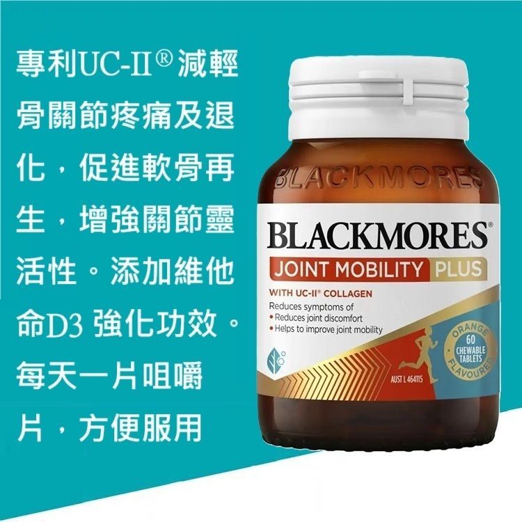 Blackmores 金裝UC-II關節膠原蛋白可修補關節軟骨減輕關節痛楚,有助提升活動能力及強韌關節。每日只需一片美味的天然香橙味咀嚼片,香甜可口,方便隨時服用。