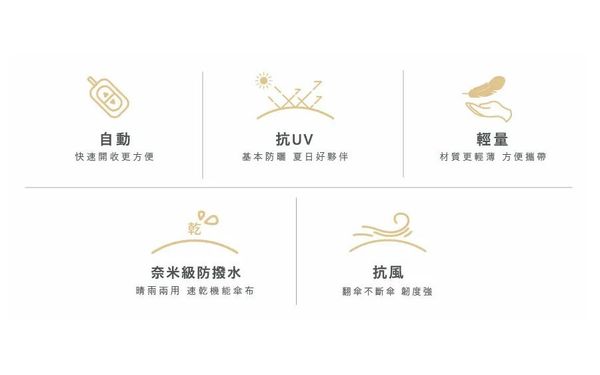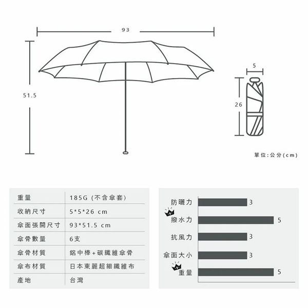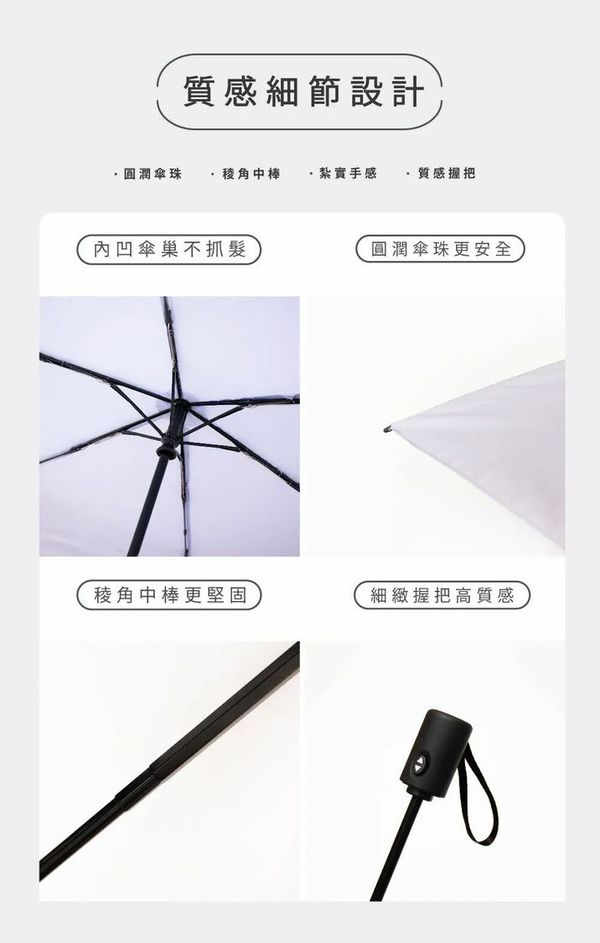 20吋小型傘面 一個人剛剛好,放包包沒負擔 日本東麗科技布 極佳的撥水效果,遇傘面成水珠,一甩即乾 6骨結構+碳纖維 結構完整+碳纖維不怕風透透 自動傘 一鍵開收,讓你單手開收傘,不再狼狽過雨天