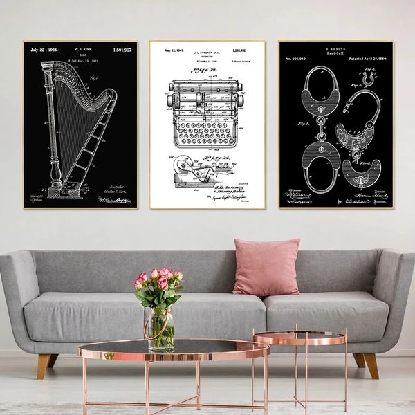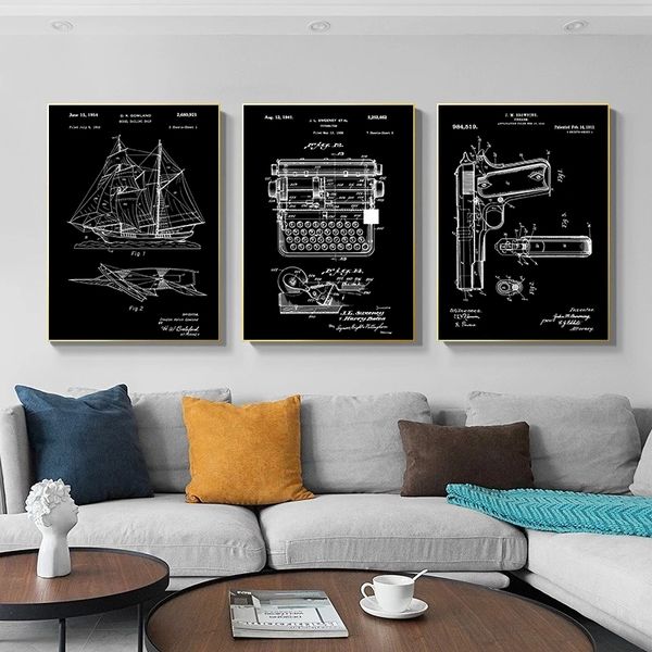 專利黑白海報復古樂器運動器材槍畫帆布印刷海報家居房間裝飾