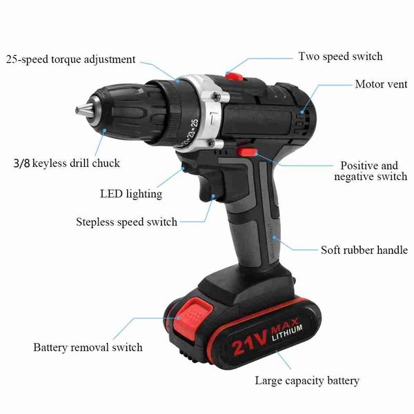 高功率鋰電池無線充電21V電動衝擊無線電鑽手電筒手電筒家用DIY電動工具