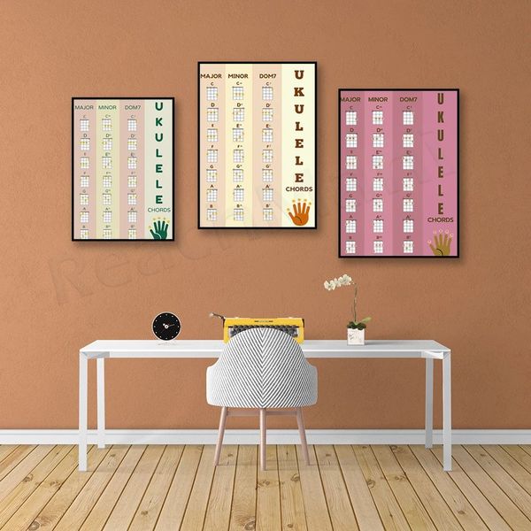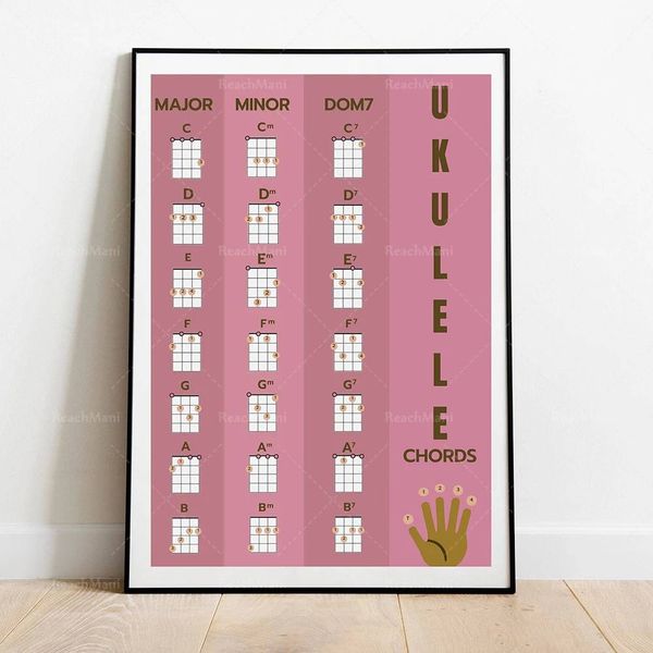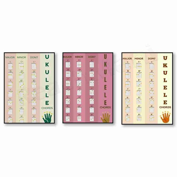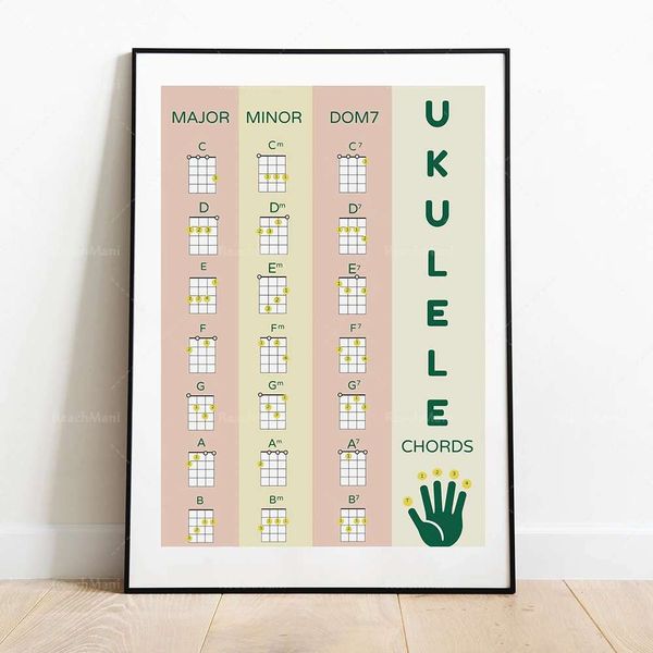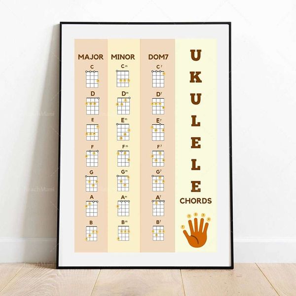 初學者尤克里裡琴和弦海報、音樂印刷品、烏克麗麗情人節卡片、樂器海報、烏克麗麗琴手和手指