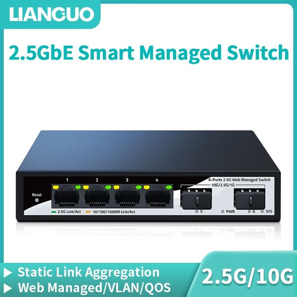 LIANGUO 2.5GbE 智慧型管理交換器 4 連接埠 2500M 網路 10G SFP+插槽 Web 管理靜態連結聚合家庭實驗室設定交換機