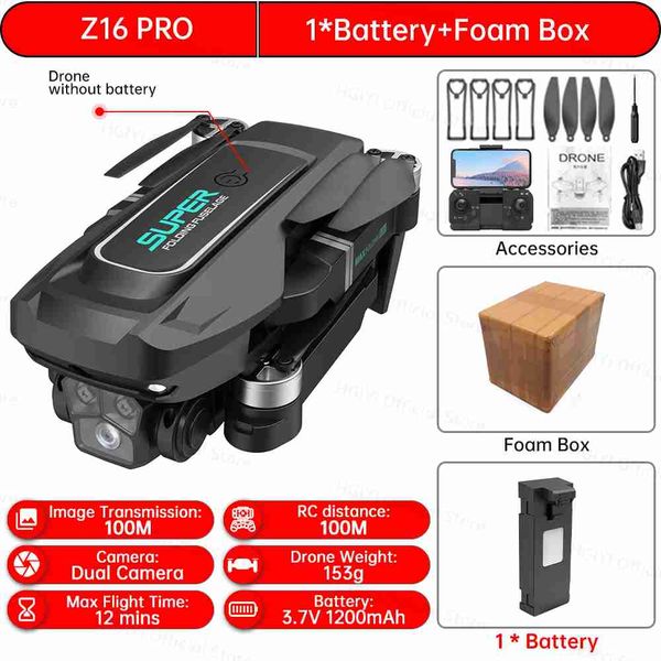 Z16 PRO 遙控無人機帶雙攝像頭 2.4G WiFi 可折疊四軸飛行器紅外線避障遙控直升機玩具兒童禮物描述:壓力感測器:高度設定定位器:光流定位電機:1503無刷電機電氣調節:4000/KV圖傳接收方式:2.4 WIFI鏡頭:自穩定電子防手震鏡頭遙控器電池:AA*3 需另購買智慧型鋰電池容量:3.7V 1200mAh 4.44Wh控制距離(無幹擾、無遮蔽):100M飛行時間:約18分鐘充電時間:約1.5小時USB充電:5V產品尺寸:折疊:14.2*7*9CM 展開:30*27*9CM包裝尺寸:22.5*17.8*7CM起飛重量:190公克相機參數像素:4K/6K高畫質相機攝影鏡頭可調-45°-90°WiFi圖傳距離:(無幹擾、無遮蔽)約30m焦距:50X幀率 25 fps手勢拍攝/影片重建:1-5M功能描述:1.前置鏡頭配備廣角8K高畫質WIFI,底部高畫質鏡頭搭配光流,可切換拍攝角度,2.雙軸雲台穩定設計,拍攝角度更廣3.高度固定功能具有高度維持模式功能,光流定位定點功能確保飛行穩定。4.超長續航力3.7V 1200mAh鋰離子電池,續航力約18分鐘,5. 自訂航線,可以在App上繪製自己想要飛行的照片6.APP手機操控,一鍵後退,無頭模式,上下,前後,左右飛行7.手勢拍照,光流定位,無刷電機,超長續航,避障雲台組件,遇障礙物自動停止,No與障礙物碰撞8.無刷馬達動力更強,壽命更長,抗風能力更強。9.本產品體積和重量都很輕,機身重量190克,可以規避各國的空中交通管制規定(有些國家要求250克以上的無人機需要認證或註冊,190克可以免除認證和註冊的挑戰)10.2.4GHz抗干擾技術,六軸陀螺儀,飛行更穩定,操控更便利。11.低電量警報,當電池電量低時,遙控器會發出警報聲12.機身上炫彩燈讓無人機在夜間更明亮包裝包括:1 x Z16 遙控四軸飛行器1 個遙控器1 x 3.7V 1200mAh鋰電池4 個備用螺旋槳1xUSB充電線1 把螺絲起子2 x 手冊東九龍倉庫網站https://shophoho.com
