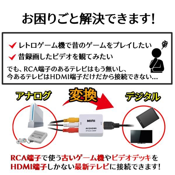這是一款可以將「RCA(三色線)轉HDMI線」的轉接線。 (注意)HDMI 到 RCA 的轉換是不可能的。 「我想在復古遊戲機上玩舊遊戲」 「我想看很久以前錄製的影片」 但我家裡沒有支援 RCA 電纜的電視,而且 我家裡的電視只有 HDMI 連接埠……如果 您擔心這個問題,我們可以解決您的問題。本產品可讓您在最新的電視、錄影機、智慧型手機和其他相容於 HDMI 的裝置上顯示 具有複合輸出(紅、白、黃 AV 線)的復古遊戲機和錄影機的影片和影像。 *使用本產品時需要電源。如果沒有供電,則不會輸出視訊。*請選擇“NTSC”作為視訊輸出設定。*根據顯示器、電視、智慧型手機等型號,可能與使用環境不相容。*HDMI 的最大輸入解析度為 1080P。*不含 HDMI 線、RCA 線(紅色、白色、黃色線)。【商品詳情】■尺寸60mm x 54mm x 20mm ■顏色 2種(黑色、白色)■附件USB/miniUSB 電源線 [長度:(約)45cm]