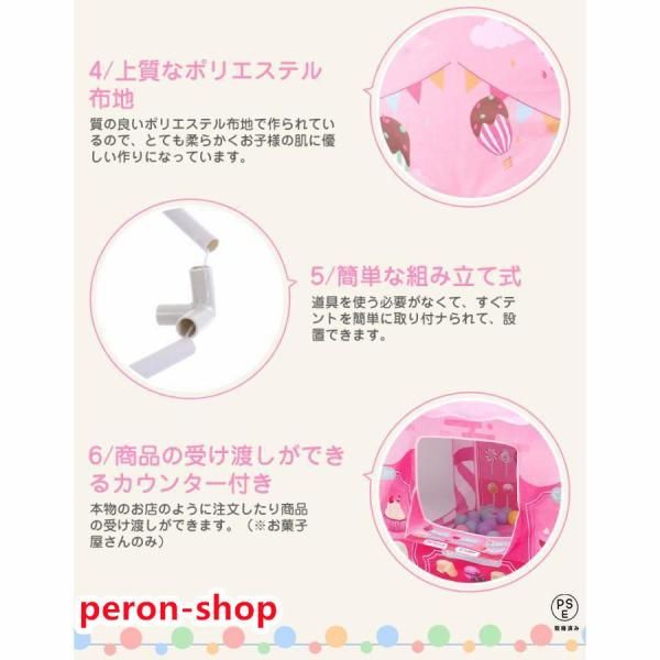 [規格] 材質:織物/防水聚酯纖維 桿/PVC 桿 類型:冰淇淋店、糖果店 尺寸:組裝後/約。 100 x 70 x H110cm 存放時/冰淇淋店約。 約50 x 10 x 10cm 糖果店。 56 x 10 x 10cm 重量:約。 900g [特性] ◆新品! --糖果店 有一個帶簷的大型銷售窗口,因此您可以像在實體商店一樣訂購和接收產品。您可以透過成為糖果店老闆和顧客來享受角色扮演的樂趣。 ●室內/室外遊戲帳篷,可以滿足孩子愛玩的慾望! ●易於組裝,因此您不需要任何工具,即可輕鬆立即搭建和固定帳篷。 ●採用優質聚酯纖維布料製成,非常柔軟,對孩子的皮膚溫和。 ●不佔空間,提供孩子獨立的創作空間。這也將豐富您的孩子的想像。 ●您的孩子可以學習將玩具收拾到帳篷裡,避免弄得一團糟。 ●可以玩年糕的可愛設計的房子。