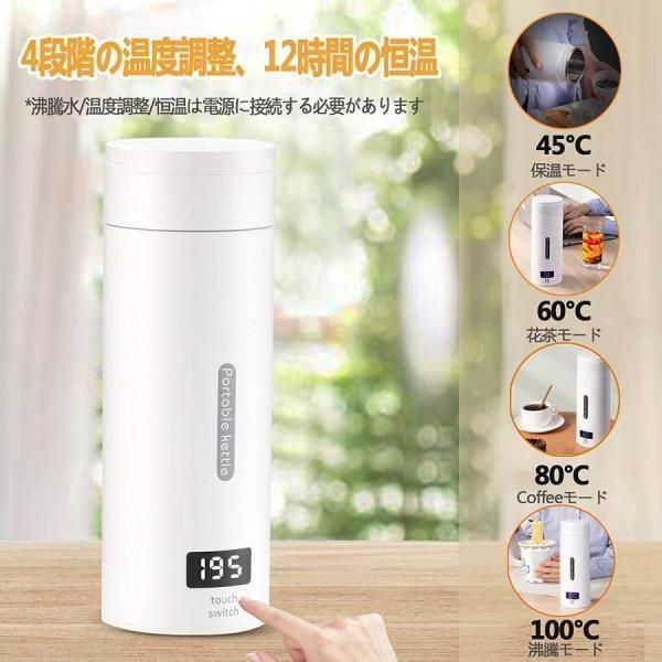 【手提電熱水壺】不僅可以當電熱水壺用,還可以當保溫杯用。它便攜且防水,讓您可以隨時享用熱水、茶、咖啡或準備好您的奶寶寶。 【安全快速煮沸】一鍵開關,5分鐘快速煮沸,自動斷電。採用雙層隔熱設計的小水壺。具有防乾燒、防滑底部和出色的穩定性。 【4級溫度設定】依需求設定溫度。奶粉(45攝氏度)。珍珠奶茶(60攝氏度)。沖泡咖啡(80度C)。沸騰(100攝氏度)。食品級 304 不鏽鋼,雙重絕緣,不含 PBA。這是適合家庭、旅行、辦公室或學生住宿的完美禮物。 【健康多功能】隨時提供寶寶熱水、茶、咖啡、點心和牛奶。無論您是在旅途中、在工作中或在飯店,都能感受到賓至如歸的感覺。 [易於清潔] 現代電熱水壺將時尚、精緻的風格與功能性融為一體,非常適合簡約的廚房。採用無縫沖壓和拉伸成型工藝,
