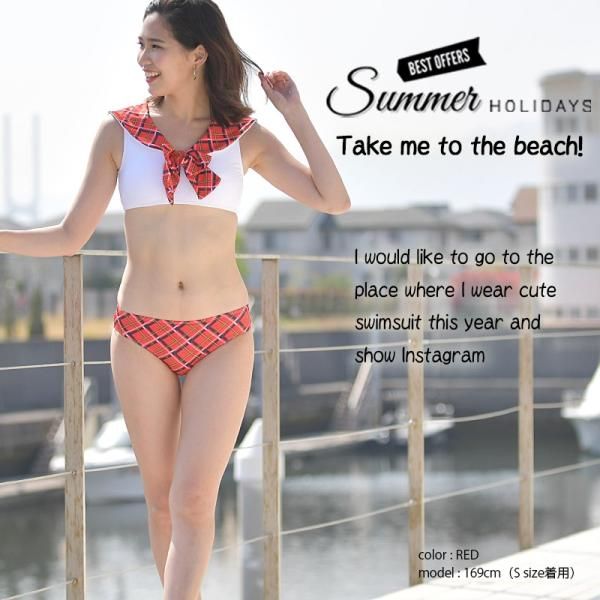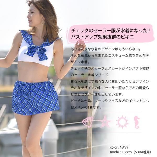 以格子水手服為主題設計的泳衣。格紋圍巾和裙子給人留下深刻印象!融合了水手服的可愛與性感。也推薦用於海灘、游泳池和節慶等活動! ! 商品名稱:格紋水手比基尼3件組 產品詳情: 尺寸:S、M、L 3個尺寸 材質:82%聚酯纖維、18%氨綸 UPF50+布料 UV防護率:95%以上 相關關鍵字:高中生、國中生、女孩、時尚、成熟、青少年、20多歲、30多歲、40多歲