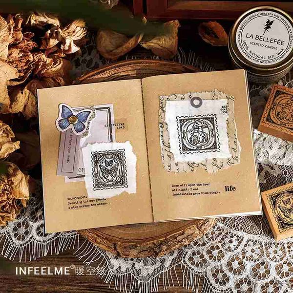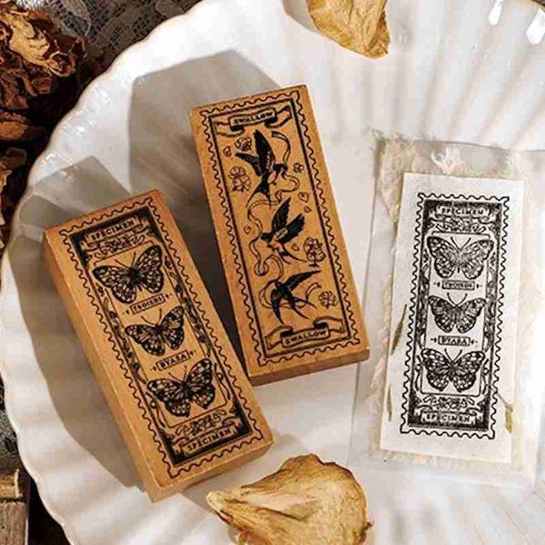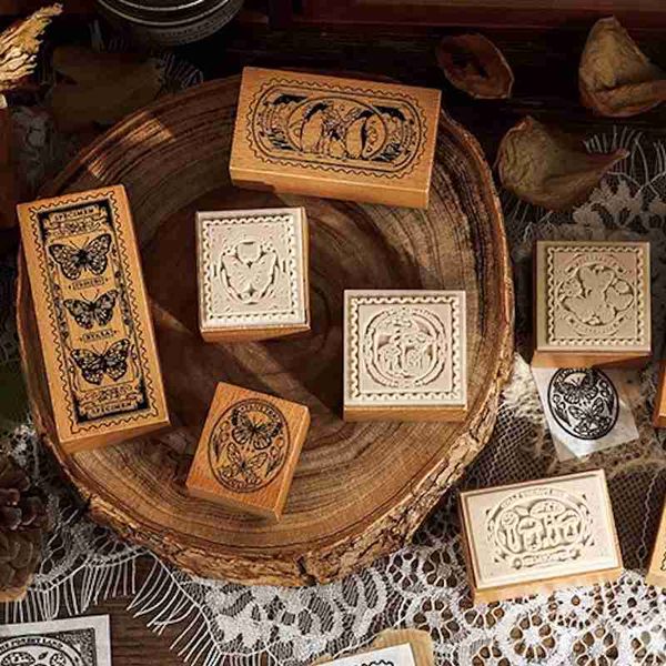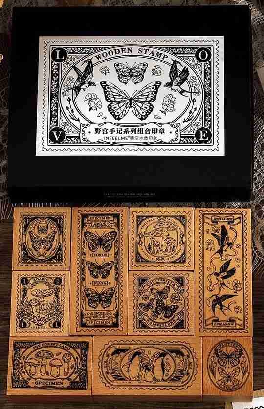 復古剪貼簿印章組 - 蝴蝶、鳥類、蘑菇圖案手印模具 - 手工日記卡裝飾DIY用品