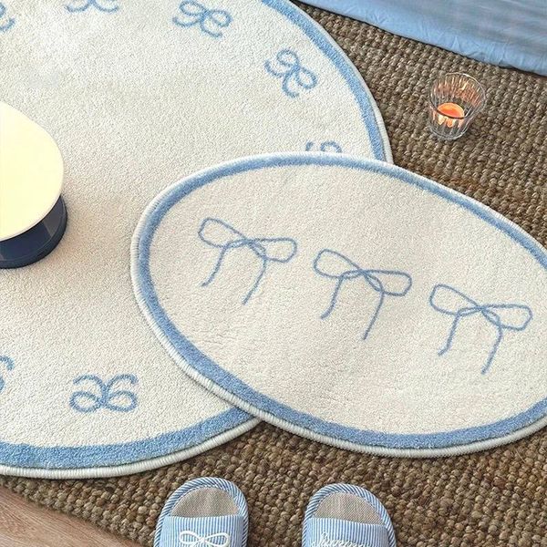 INS 藍色蝴蝶結床邊地毯女孩地毯適用於臥室裝飾防滑柔軟地毯橢圓形地毯適用於客廳毛絨地毯