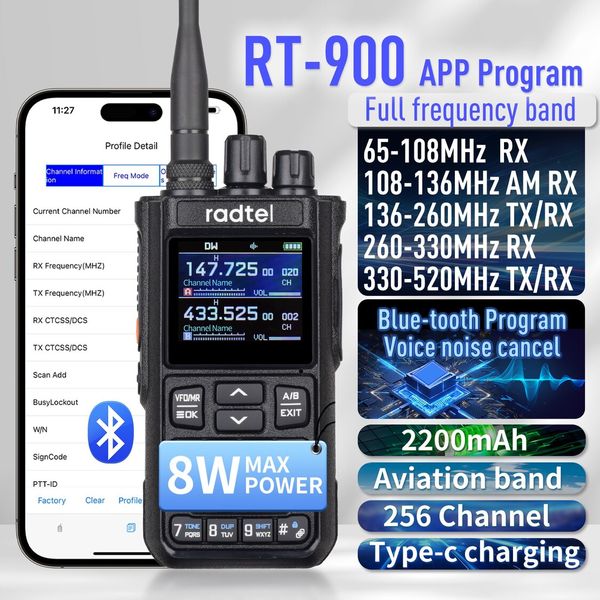 Radtel RT-900 8W 全波段業餘無線電對講機 256CH 航空波段雙向無線電台航空 NOAA 警察海洋河流 PTT