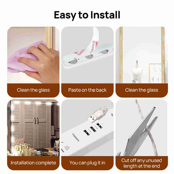 5. 10 等級亮度調整:提供 10 種不同的亮度設置,使用者可依個人喜好和環境需求調整鏡面燈帶。這些鏡上燈安裝簡單,無需專業工具即可快速輕鬆地設置,並能提供化妝燈光效果。