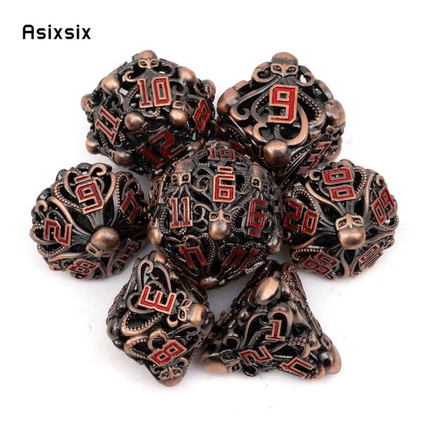 7 件銅紅魷魚金屬骰子空心金屬多面骰子套裝適用於角色扮演 RPG 棋盤遊戲紙牌遊戲