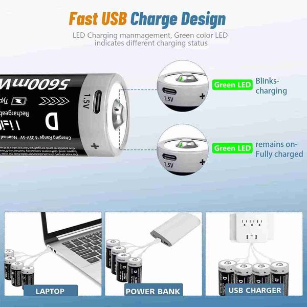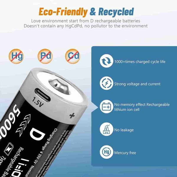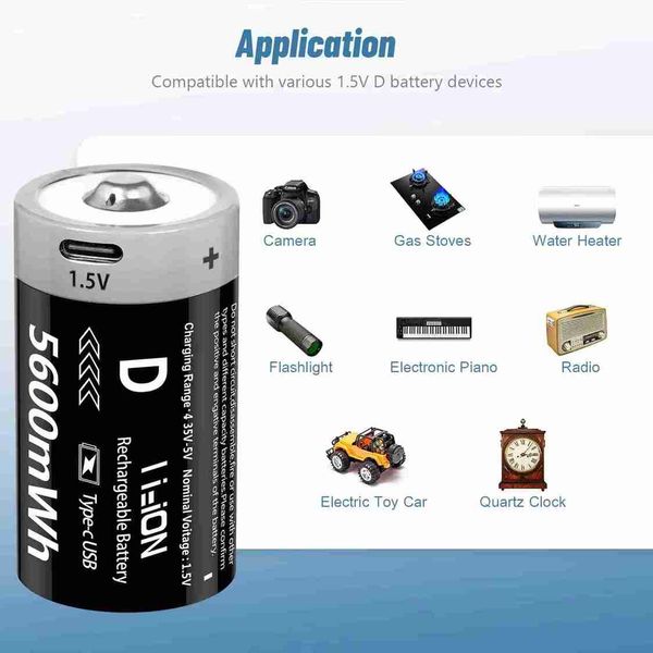 尺寸:D設定類型:僅限電池類型:鋰離子標稱容量:5600毫W時型號:1.5VD尺寸電池BrandName:leadessOrigin:MainlandChinaCertification:CE,FCC,RoHS規格:系統:鋰離子電池類型:D容量:5600mWh電壓:1.5V最大放電電流:2.2A溫度:-40℃~60℃尺寸:32x62mm(1.26x2.44in)特徵:D型鋰離子電池:1.高能量密度鋰離子電池,自放電率低,循環壽命長達1200次,無記憶效應,非常適合時鐘、遙控器、相機、手電筒等家用設備。電池可重複使用。更環保,更經濟。2.5600mWh1.5VUSB鋰離子D型電池,容量高,提供穩定電壓直到整個電池耗盡,可在裝置中長期使用。自放電率極低,可長期存放。3.輕鬆充電,4.5小時內快速充電:先進的iQuick充電技術,帶DC5V/2AUSB輸入。內建LED燈顯示充電過程,綠燈閃爍表示充電中,綠燈常亮表示充滿電。The Best-ONEThe Best