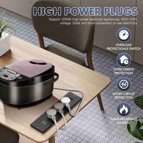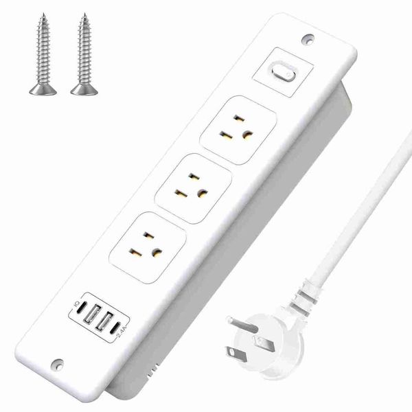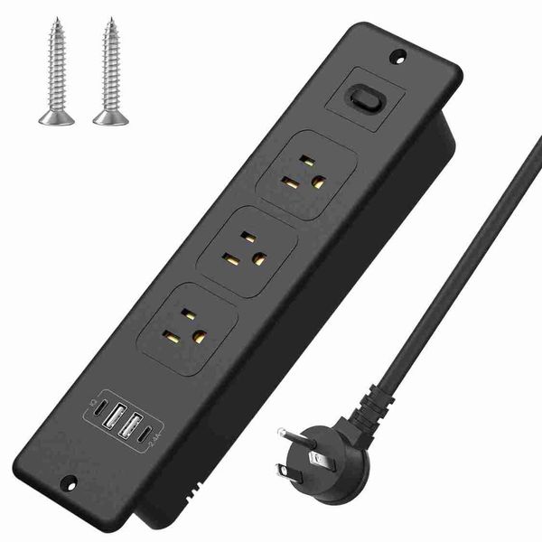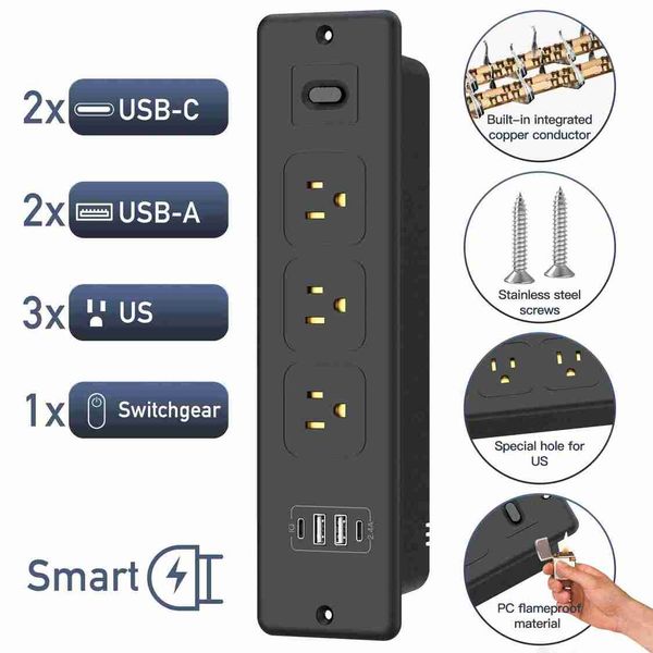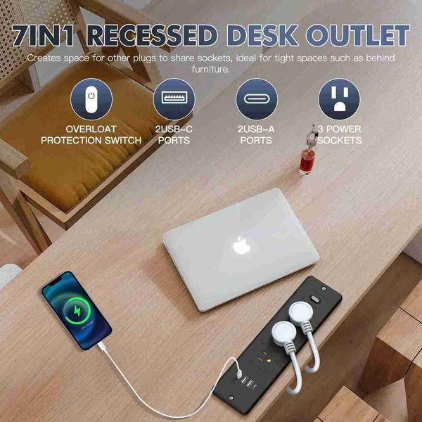 7合1美規插頭嵌入式電源板桌面隱藏插座USB-C/A快充+3孔供電1.8米延長線