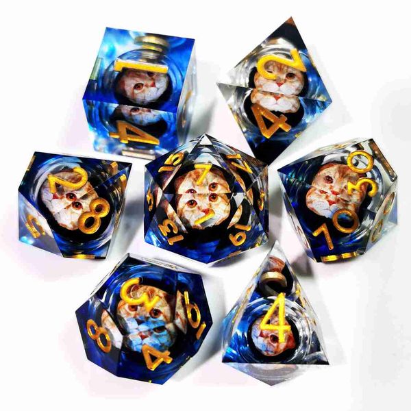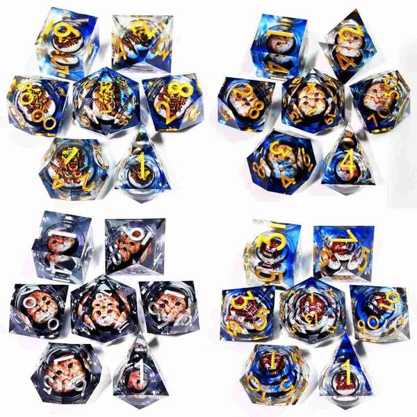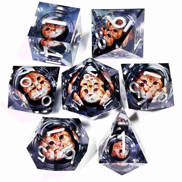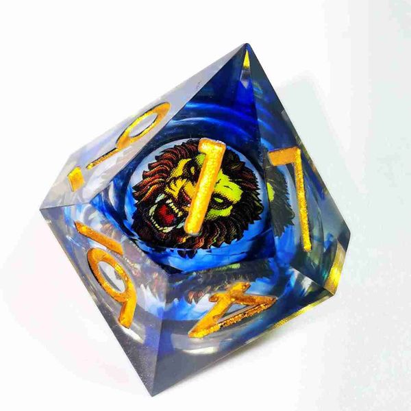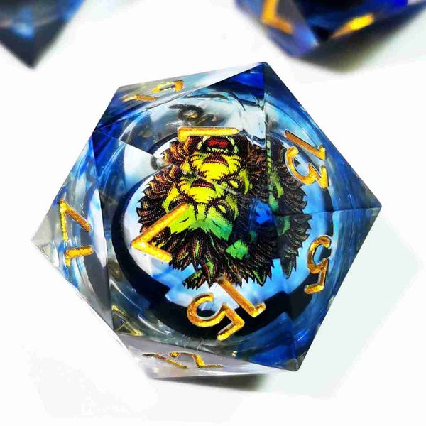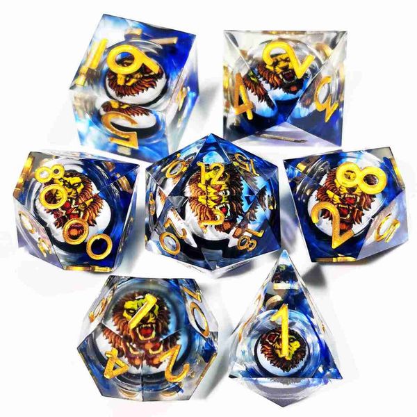 DnD 骰子套裝 - 7 件樹脂透明獅子圖案骰子,帶旋轉龍眼核,適用於 D&D RPG 遊戲