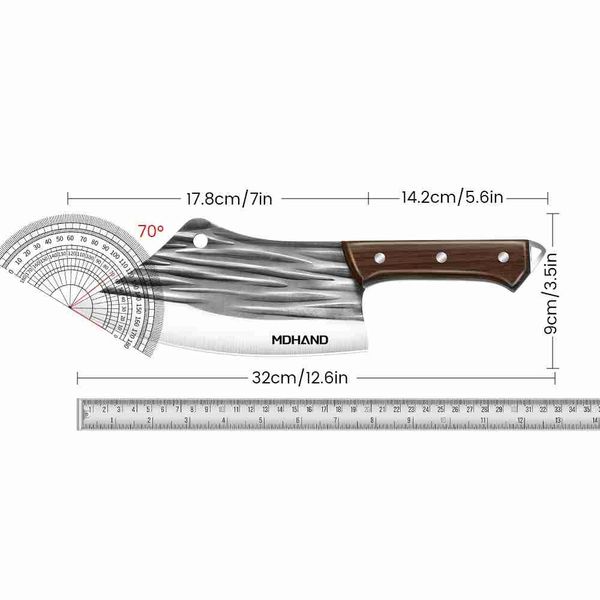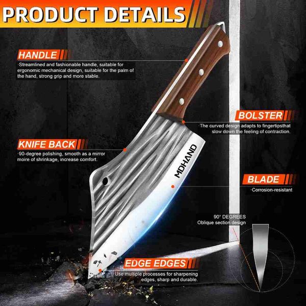 葉片角度:>60°手柄長度:14.2厘米刀刃長度:17.8厘米鋒利的刀片:Yes刀片材質:NO銹鋼Feature:Eco-FriendlyCertification:CE/EU,CIQMaterial:StainlessSteelKnifeType:ChefKnivesBrandName:ZengOrigin:MainlandChinaType:Knives用途:主要用於肉類處理,包括切割、剁碎和切碎。手柄材質:紋理黑色塑膠或合成材質,增加抓握舒適度和穩定性。刀片材質:優質NO銹鋼或其他高強度合金鋼,確保耐用性和鋒利度。特色:切割能力:特別適合切割大塊肉,如牛排、豬肉、雞肉等。切碎功能:能夠輕鬆處理骨頭和較堅硬的部位,適合家禽或小型牲畜的初步處理。切碎效果:可用於切碎肉或香料、準備餡料或其他食材。防滑手柄:手柄上的條紋設計增加了摩擦力,抓握更牢固,降低了滑倒的風險,特別適合用濕手或油膩的環境使用。人體工學設計:手把的人體工學形狀使長時間使用NO易疲勞,並提供更好的控制體驗。美觀:黑色條紋手柄NO僅實用而且時尚,適合所有廚房風格。易於清潔:刀具表面光滑,易於清潔並保持衛生。使用建議維護:定期磨刀,保持刀刃鋒利,避免刀具變鈍影響使用效果。儲存:存放在乾燥的地方,最好使用刀架或刀套保護刀片,延長使用壽命。適用場合:適用於家庭廚房、專業廚房、屠宰場等場景。清潔與保養清潔:每次使用後立即清洗,避免食物殘渣造成腐蝕。乾燥:清潔後徹底乾燥,防止生鏽。潤滑:可適當塗抹食品級潤滑劑,保護刀片。包裝包括:1*廚師刀1*刀套1*禮品盒The Best-ONEThe Best