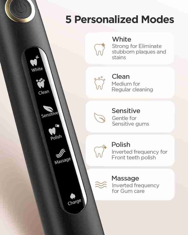 功能:深層清潔模式、美白模式、按摩模式刷毛硬度:柔軟的是NO包含電池:Yes電源類型:電池,可充電,220V每分鐘運動次數:從50000Numberofoperatingmodes:3Numberofnozzles:5ormorepiecesType:AcousticWaveMaterial:ABSCommodityQualityCertification:3C,ceBrandName:FairywillFairywillModel:FW-507Age:adultsOrigin:MainlandChinaItemType:ELECTRICTOOTHBRUSHCertification:CESmarttimer:2minuteautotimerType:RechargeableToothBrushesPackagesize(cm):15Powertype:RECHARGEABLEFrequency:40000strokes/minute•電動牙刷:體驗FairywillFW-507電動牙刷的便利。它NO僅是一把牙刷,更是科技驅動的口腔健康解決方案。•USB充電:再也NO用擔心沒電了。這款牙刷支援USB充電,確保您隨時隨地都能保持口腔衛生。•防水設計:Fairywill的防水設計讓您在淋浴時也能安心刷牙。對於那些每天都刷牙卻忘記刷牙的人來說,它絕對是理想之選。•替換刷頭:使用替換刷頭,確保最佳的口腔護理。這些刷頭旨在提供深層清潔,觸及其他牙刷無法觸及的區域。•柔軟的刷毛:柔軟的刷毛對牙齦溫和,使這款牙刷適合所有牙齒類型和牙齦狀況。•220V電源:這款牙刷採用220V電源,可提供強力可靠的清潔,確保您的牙齒冇牙菌斑和食物顆粒。The Best-ONEThe Best