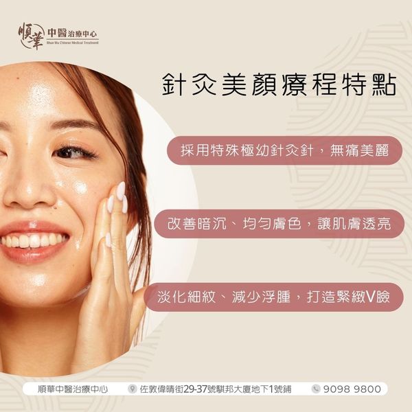 美顏針療程是一種結合了中醫針灸和美容理論的綜合治療方法。它利用微細的針頭在特定的穴位上進行刺激,以促進皮膚細胞的再生和修復。這種療程不僅可以改善皮膚外觀,還可以提升皮膚的整體健康狀態。順華中醫美顏針由註冊中醫師主理,每位中醫師都具有豐富的美顏針療程經驗。他們會根據您的皮膚狀況和需求,制定個性化的治療方案,確保最佳的效果。我們使用的針灸針頭非常細小,並遵循嚴格的衛生標準,以確保您的安全和舒適。